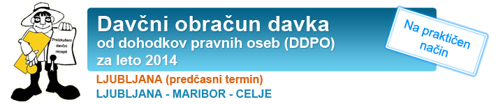 - olajšave za 2014 (pokrivanje davčnih izgub v obračunu DDPO za 2014, olajšava za investiranje, vlaganja v raziskave in razvoj, olajšave za Pomurje, Pokolpje, Maribor s širšo okolico, Hrastnik, Radeče in Trbovlje, olajšave iz naslova zaposlovanja, za zaposlovanje invalidov, za izvajanje praktičnega dela, prostovoljno pokojninsko zavarovanje, donacije);