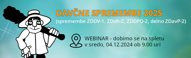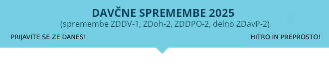 Vse predvidene davčne spremembe smo združili v en obsežen webinar v smeri racionalizacije vaših stroškov. Če si webinarja ne boste mogli ogledati v celoti ali ga ne boste mogli spremljati na razpisani dan, boste imeli možnost kasnejšega ogleda posnetka. Gradivo vam bomo tokrat izjemoma poslali v elektronski obliki na vaš e-poštni naslov.