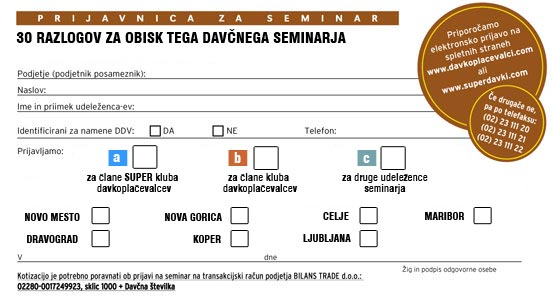 • na spletnih straneh www.superdavki.com (samo člani SUPER kluba davkoplačevalcev) in na spletnih straneh www.davkoplacevalci.com s pomočjo elektronske prijavnice ali telefax (02) 23 111 20;