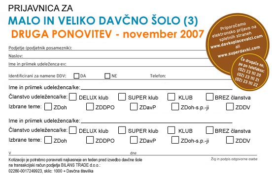Vašo prijavo in plačilo kotizacije pričakujemo najkasneje 1 teden pred izvedbo davčne šole. Prijavo lahko izvedete tudi na spletnih straneh www.superdavki.com (samo člani DELUX in SUPER kluba davkoplačevalcev) in na spletnih straneh www.davkoplacevalci.com s pomočjo elektronske prijavnice.