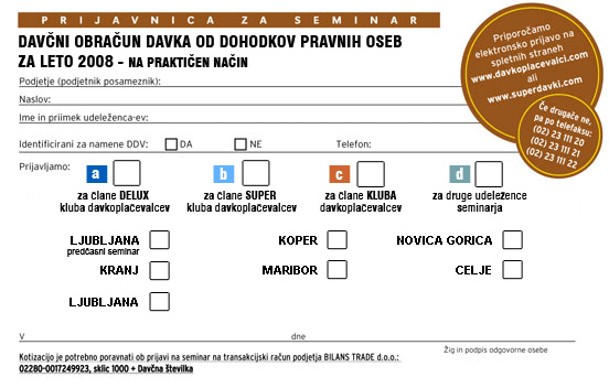 • na spletnih straneh www.superdavki.com (samo člani DELUX Super kluba davkoplačevalcev) - e-prijavnica;