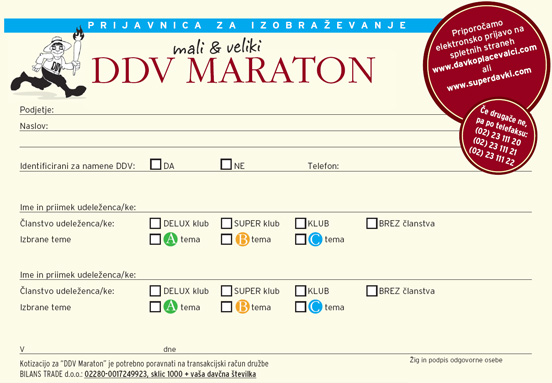 Vašo prijavo in plačilo kotizacije pričakujemo najkasneje 1 teden pred izvedbo DDV MARATONA. Prijavo lahko izvedete tudi na spletnih straneh www.superdavki.com (samo člani DELUX in SUPER kluba davkoplačevalcev) in na spletnih straneh www.davkoplacevalci.com s pomočjo elektronske prijavnice.