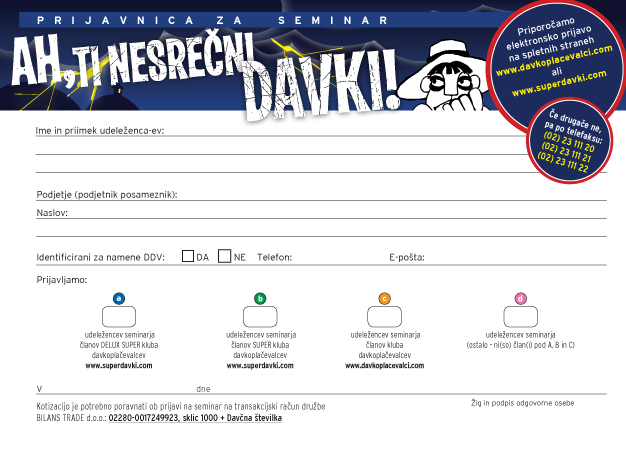 Navedite, da ste udeleženec izobraževanja "AH, TI NESREČNI DAVKI", zaradi že izvedenih rezervacij sob.