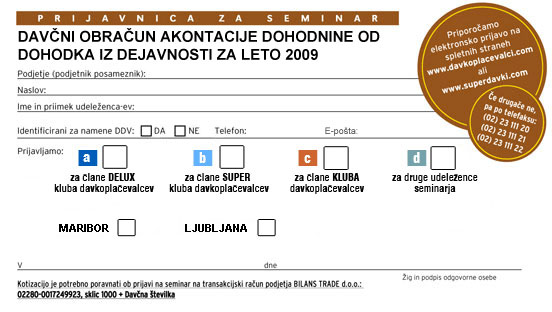 • na spletnih straneh www.superdavki.com (samo člani DELUX Super kluba davkoplačevalcev) - e-prijavnica;