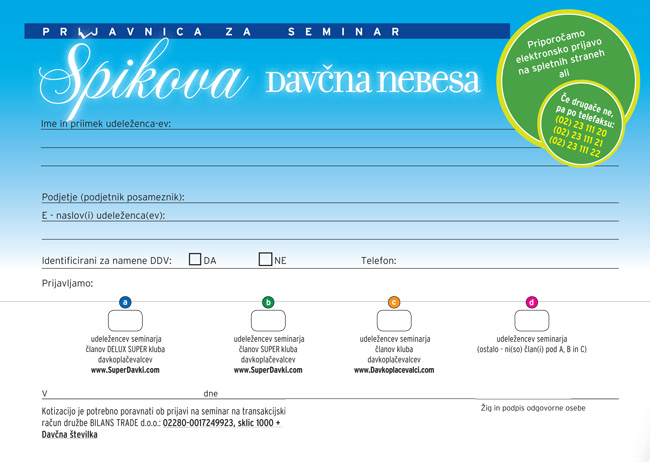 • na spletnih straneh www.superdavki.com (samo člani (DELUX) Super kluba davkoplačevalcev); • na spletnih straneh www.davkoplacevalci.com (samo člani kluba davkoplačevalcev); s pomočjo elektronske prijavnice; ali