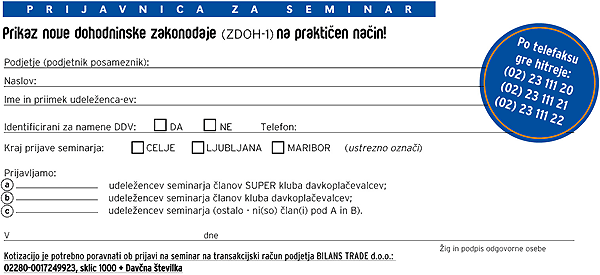Število udeležencev seminarja je omejeno. Prosimo, da kotizacijo nakažete pred pričetkom seminarja na transakcijski račun družbe BILANS TRADE d.o.o. številka 02280-0017249923 ter sklic : 1000 + davčna številka (družbe ali podjetnika posameznika).