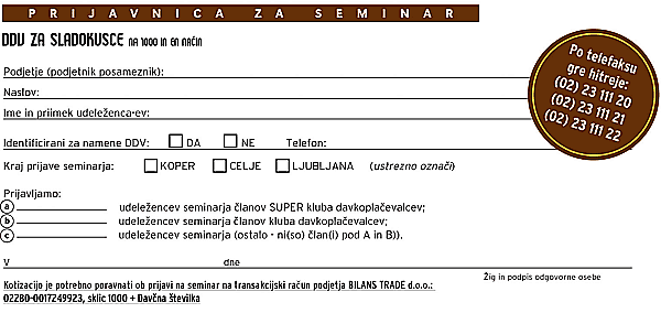 PRIJAVE IN PLAČILA Vašo prijavo in plačilo kotizacije za seminar pričakujemo najkasneje dva dni pred izvedbo seminarja. Prijavo lahko izvedete tudi na spletni strani www.superdavki.com (samo člani SUPER kluba davkoplačevalcev) in na spletni strani www.davkoplacevalci.com s pomočjo elektronske prijavnice. |
