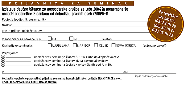 Število udeležencev seminarja je omejeno. Prosimo, da kotizacijo nakažete pred pričetkom seminarja na transakcijski račun družbe BILANS TRADE d.o.o. številka 02280-0017249923 ter sklic : 1000 + davčna številka (družbe ali podjetnika posameznika).