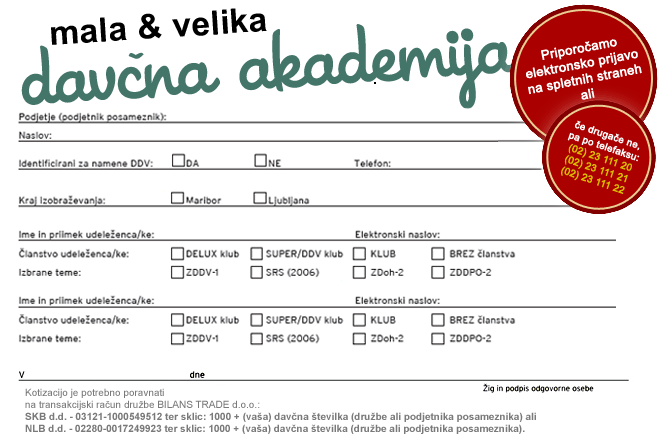 Izkoristite članski popust za udeležence izobraževanj in postanite član kluba davkoplačevalcev in/ali DELUX/Super/DDV kluba davkoplačevalcev.