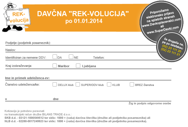 SpoštovaniIzkoristite članski popust za udeležence izobraževanj in postanite član kluba davkoplačevalcev in/ali (DELUX) Super kluba davkoplačevalcev. |