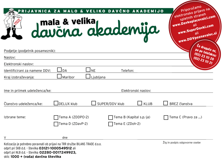 Izkoristite članski popust za udeležence izobraževanj in postanite član kluba davkoplačevalcev in/ali DELUX/Super/DDV kluba davkoplačevalcev.