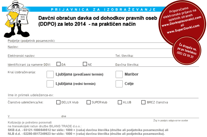 Prosimo, da kotizacijo nakažete najkasneje 2 dni pred pričetkom seminarja na transakcijski račun družbe BILANS TRADE d.o.o., Ulica heroja Bračiča 6, 2000 MARIBOR, številka: